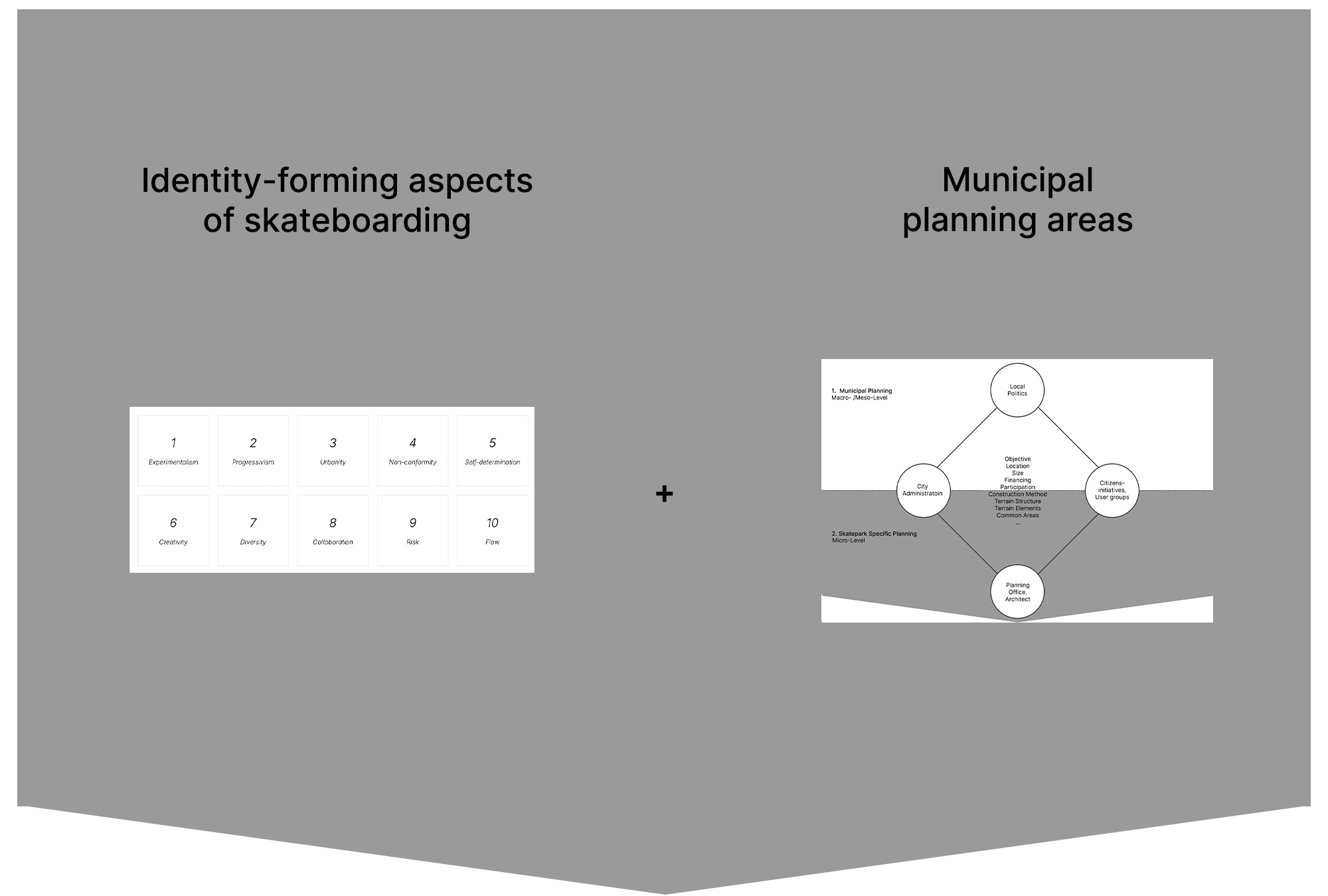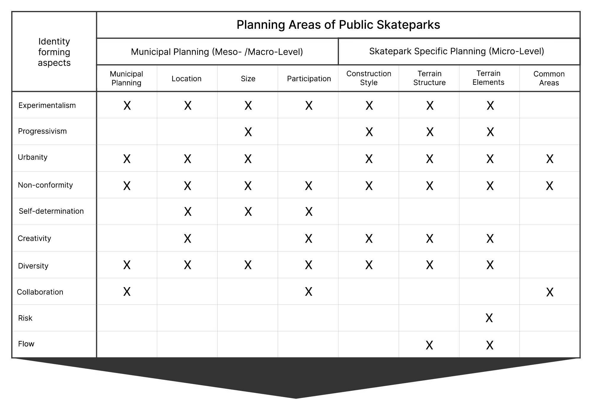 In order to define fundamental design guidelines for skateparks, the identity-forming aspects of skateboarding are applied to the previously outlined sectors of municipal planning.