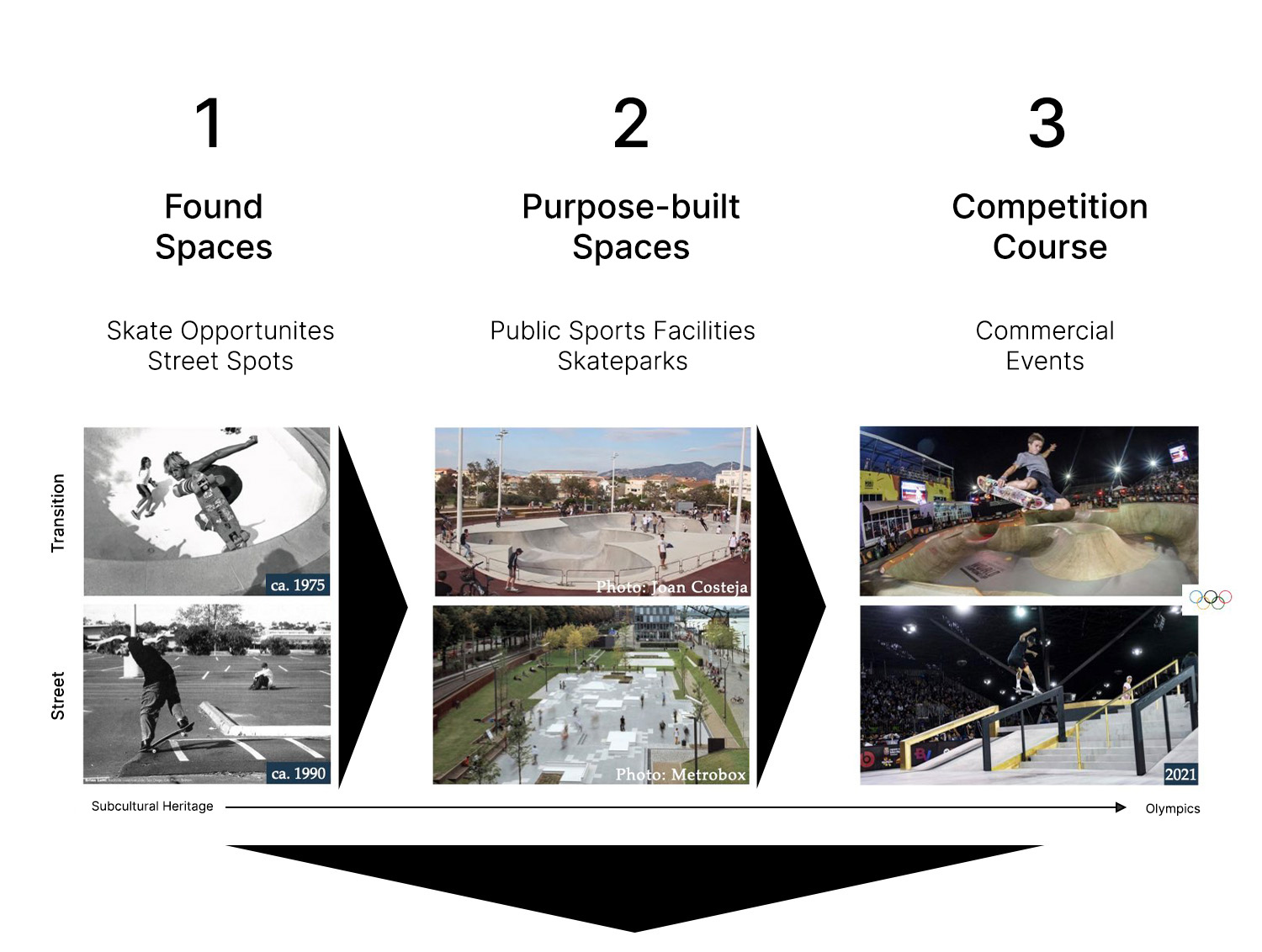 At the intersection between subculture and sportisation, the positioning model outlines a number of opportunities for cities and municipalities to create spaces for skateboarding and urban movement practices beyond conventional skateparks.