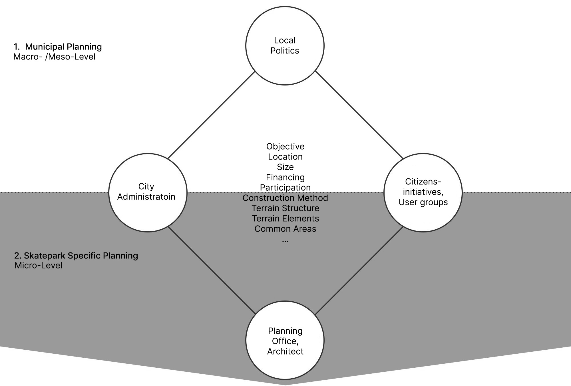 The groups of individuals and organizations involved in municipal skatepark planning, as well as the main planning areas, can be visualized as follows: